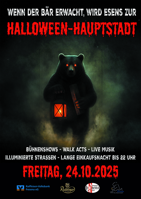 Freitag, 24. Oktober 2025 – Die Nacht senkt sich herab. Es ist wieder Halloween und wie jedes Jahr werden die Straßen in Esens von unzähligen Hexen, Geistern, Zombies und anderen gruseligen Gestalten belagert sein. Im Laufe der Jahrhunderte ist in den Straßen unserer Stadt vieles geschehen. In der Halloween-Nacht werden wir aufs Neue erleben, wovon nur die Nacht Zeuge war. Hexen, Zombies und Teufel sind einmal im Jahr gern gesehene Gäste in Esens. Kommen Sie in Ihren coolsten Kostümen und lassen Sie die Knochen klappern. Verkleidung ist herzlich willkommen!